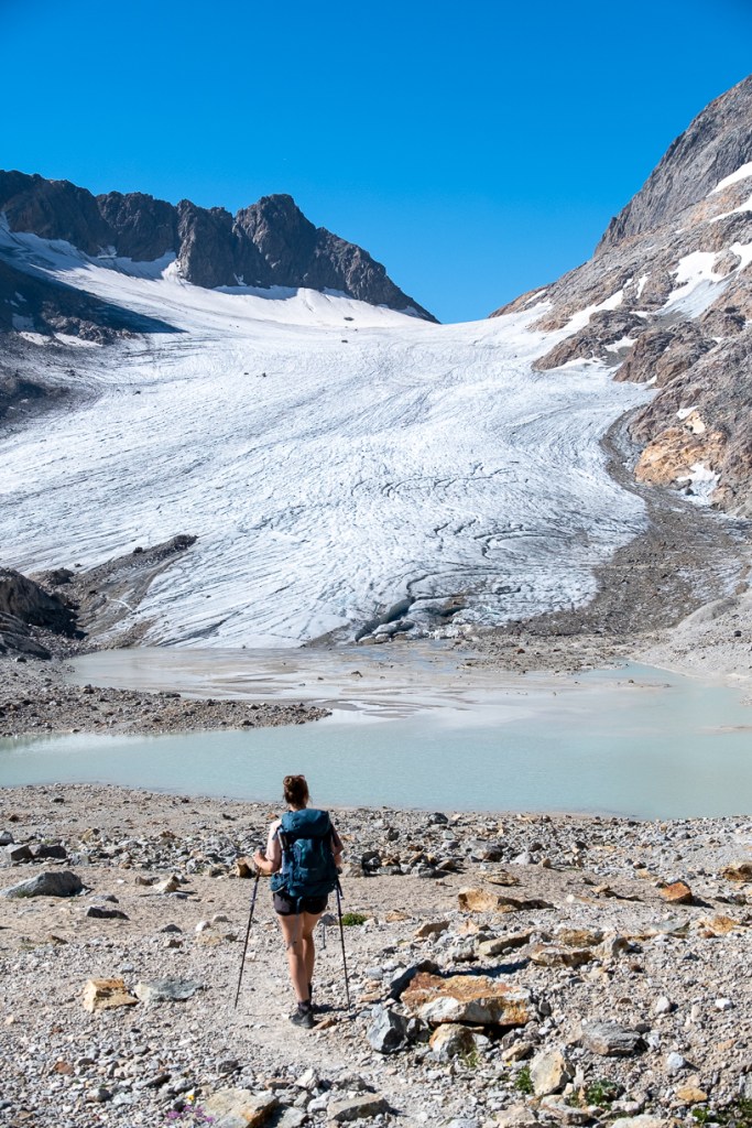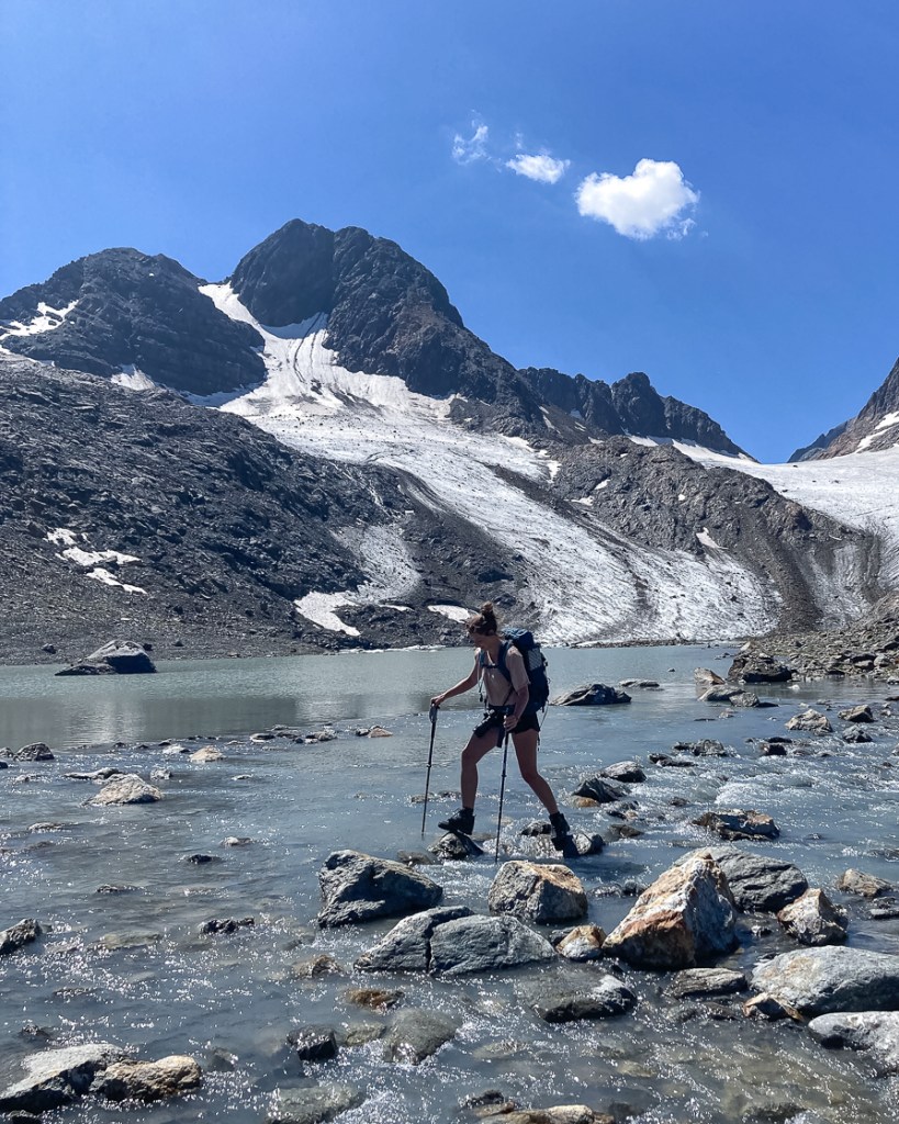 Pour vous ravitailler en eau, le lac et la rivière qui se jette dedans sont parfais si vous avez de quoi filtrer l’eau (qui arrive du glacier). Merci de ne pas vous baigner dans le lac (c’est une réserve d’eau potable pour le refuge plus bas).