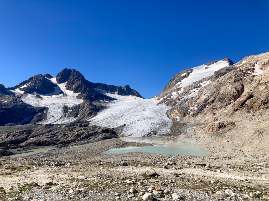 Le 2ème jour nous partons en direction du glacier de Saint Sorlin qui malheureusement a bien reculé (vous pourrez voir des photos des années précédente au refuge) mais c’est superbe de pouvoir approcher un glacier d’aussi près, sans équipement. Attention, évitez de marcher dessus, il peut y avoir des crevasses et vous pourriez tomber dedans et vous blesser.