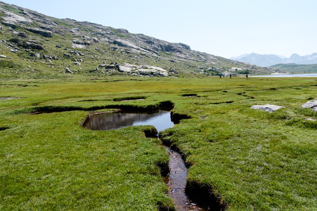 Pour goûter à la haute montagne corse sans m’attaquer à l’intégralité du GR20, j’ai choisi de faire la randonnée jusqu’au Lac de Nino, qui était recommandée dans plusieurs guides. Le paysage y est unique avec ses célèbres pozzines, ces pelouses spongieuses parsemées de points d’eau, et les chevaux et vaches en liberté qui s’y promènent.